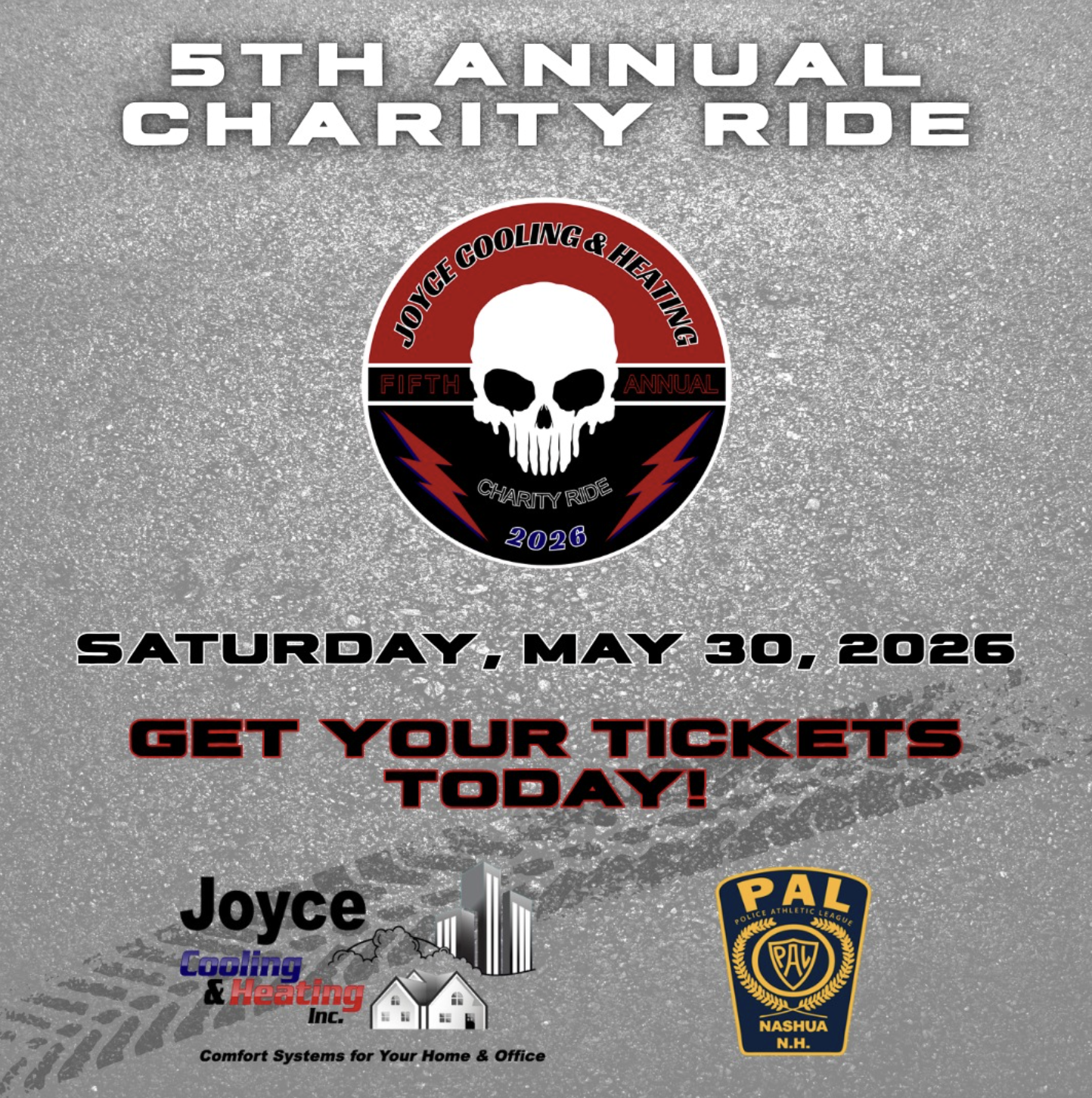 Joyce Cooling & Heating is hosting their 5th Annual Charity Ride on May 30, 2026, starting in Merrimack, NH and ending in New Boston, to benefit Nashua PAL. The event includes a morning rally with breakfast, games, and giveaways, followed by a group ride and an after-party with lunch, live music, and raffles.